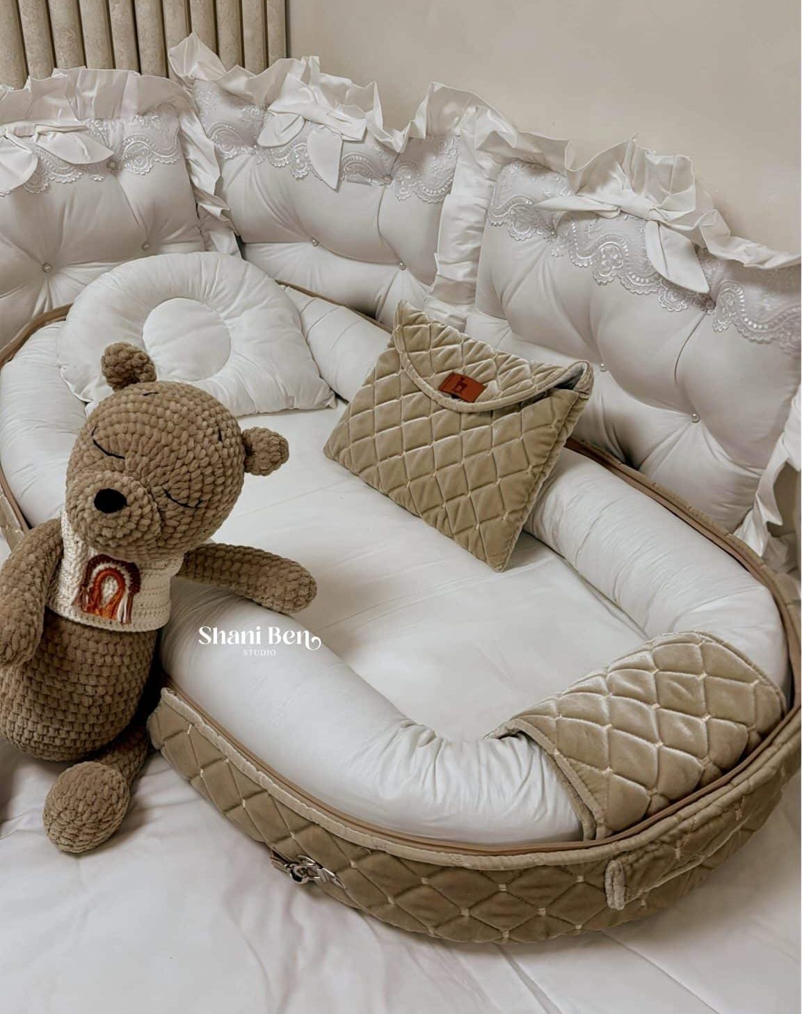 תיק שנפתח לבייבי נסט לתינוק (קן לתינוק) מבד חיצוני קטיפה גוון חום /חאקי ובחלקו הפנימי כותנה לבן מאה אחוז כותנה המותאם לגיל הרך